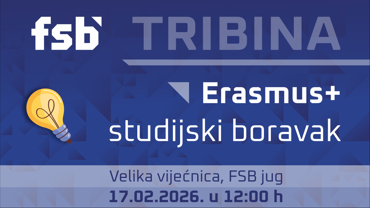 Tribina za Erasmus+ natječaj za studijski boravak - ak. god. 2026/27. Objavljen je Erasmus+ natječaj za mobilnost studenata za studijski boravak - države članice EU-a i treće zemlje pridružene programu za ak. god. 2026/27. (zimski i ljetni semestar). Za natječaj organiziramo Tribinu: Erasmus+ studijski boravak u utorak, 17. veljače u 12.00 sati u Velikoj vijećnici, FSB jug. Dolazak na tribinu ulazi u dodatne FSB bodove za rangiranje, što možete iščitati iz Odluke o kriterijima. Osnovni kriteriji:
