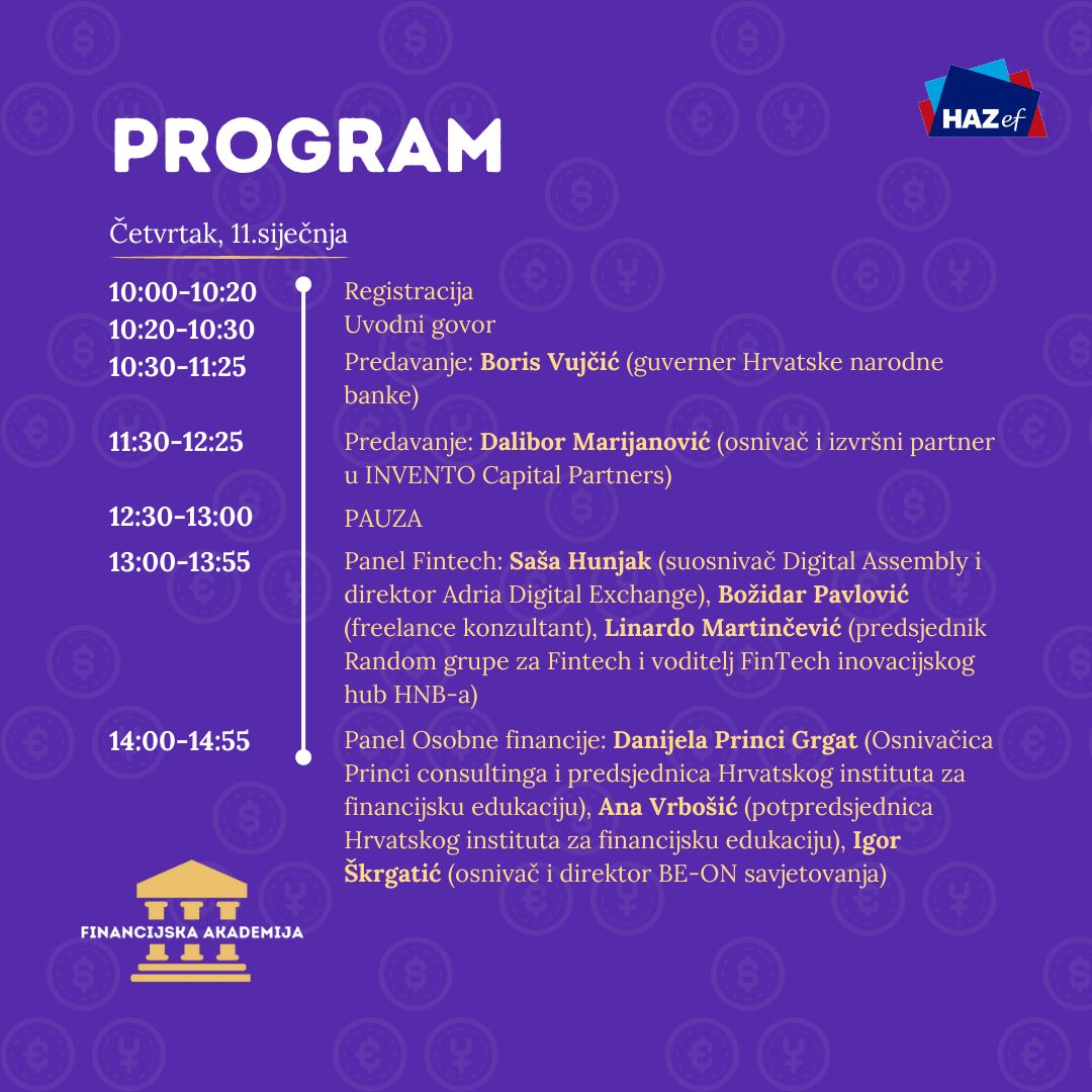 Nizom panela i predavanja želimo educirati studente i sve zainteresirane o osobnim financijama, monetarnoj politici i FinTechu te podići razinu financijske pismenosti mladih. Neki od predavača su guverner HNB-a Boris Vujčić, Dalibor Marijanović, Saša Hunjak, Danijela Princi Grgat i mnogi drugi stručnjaci. Prijave su besplatne i vrše se isključivo putem obrasca: https://forms.gle/NbAtezpB2jP8V9oQA Po završetku konferencije moguće je dobiti i certifikat kao potvrdu o sudjelovanju. Više o samoj konferenciji možete saznati u privitku te na društvenim mrežama Instagram, Facebook i LinkedIn | |