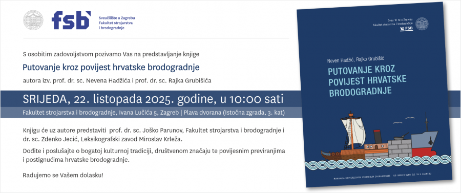 Predstavljanje će se održati u srijedu, 22. listopada 2025. godine, s početkom u 10:00 sati u SDEWES dvorani (ranijeg naziva Plava dvorana), Istočna zgrada, 3. kat, na Fakultetu strojarstva i brodogradnje. Knjigu će predstaviti prof. dr. sc. Joško Parunov s našeg fakulteta te dr. sc. Zdenko Jecić iz Leksikografskog zavoda Miroslav Krleža. Pozivamo Vas da nam se pridružite i poslušate o bogatoj kulturnoj tradiciji, društvenom značaju te povijesnim previranjima i postignućima hrvatske brodogradnje. Vjerujemo kako će ova knjiga pridonijeti boljem razumijevanju povijesti, kao i oblikovanju budućeg razvoja brodogradnje. Knjiga je izdana na hrvatskom i engleskom jeziku. Cijena hrvatskog izdanja je 25 eura, a engleskog 35 eura. Možete je nabaviti na sljedeće načine: