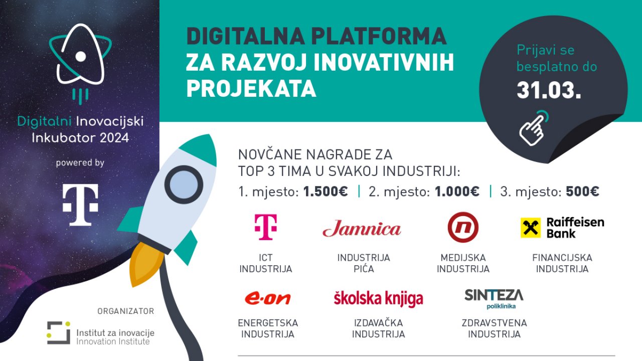 Poziv za prijave: Digitalni inovacijski inkubator 2024. Zainteresirani studenti FSB-a mogu se prijaviti za sudjelovanje u Digitalnom Inovacijskom Inkubatoru powered by Hrvatski Telekom i dožvjeti iskustvo koje će im pomoći unaprijediti osobne i profesionalne vještine.Zašto se pridružiti Inkubatoru? Stvarni utjecaj: Istražite svijet inovacija i ponudite inovativno rješenje za industriju koju smatrate zanimljivom, uz suradnju s ekspertima iz kompanija. ICT – Hrvatski Telekom, medijska industrija – Nova TV, industrija pića – Jamnica, financijska industrija – Raiffeisen banka, energetska industrija – E.ON, izdavačka industrija – Školska knjiga, zdravstvena industrija – Poliklinika Sinteza Vrijedne nagrade: Budite među najboljih 21 tima u 7 kategorija, s prilikom osvajanja do 4.500 €, zajedno s putovanjem na Web Summit 2024. u Portugal. Međunarodno iskustvo: Sudjelujte i povežite se sa studentima diljem Europe. Obogaćivanje znanja: Učite od profesora s prestižnih međunarodnih sveučilišta putem uvijek dostupnih video materijala. Personalizirane povratne informacije: Sudjelujte u jedan-na-jedan sesijama sa stručnjacima iz poduzeća i Instituta za inovacije, razgovarajući o vašem projektu i mogućnostima njegova napretka. Napredovanje u karijeri: Povećajte izglede za napredovanje u karijeri stjecanjem praktičnog iskustva, izgradnjom profesionalnih mreža i razvijanjem traženih vještina koje će vas izdvojiti na konkurentnom tržištu rada. Faze Inkubatora 1. Prijave u program – do 31.03. 2. Edukacijski program – 11.03.-24.03. 3. Prijava projekata na natječaj – 25.03.-01.04. 4. Razrada projekata – 01.04.-26.05. 5. Veliko finale i proglašenje pobjednika – 06.2024. Ako želite otkriti svoj kreativni potencijal, istražiti nove izazove i biti dio dinamične digitalne zajednice, kliknite na link kako biste se prijavili pojedinačno ili kao tim do 31. ožujka! https://digitalniinkubator.eu/inovacijski/prijava/ | |