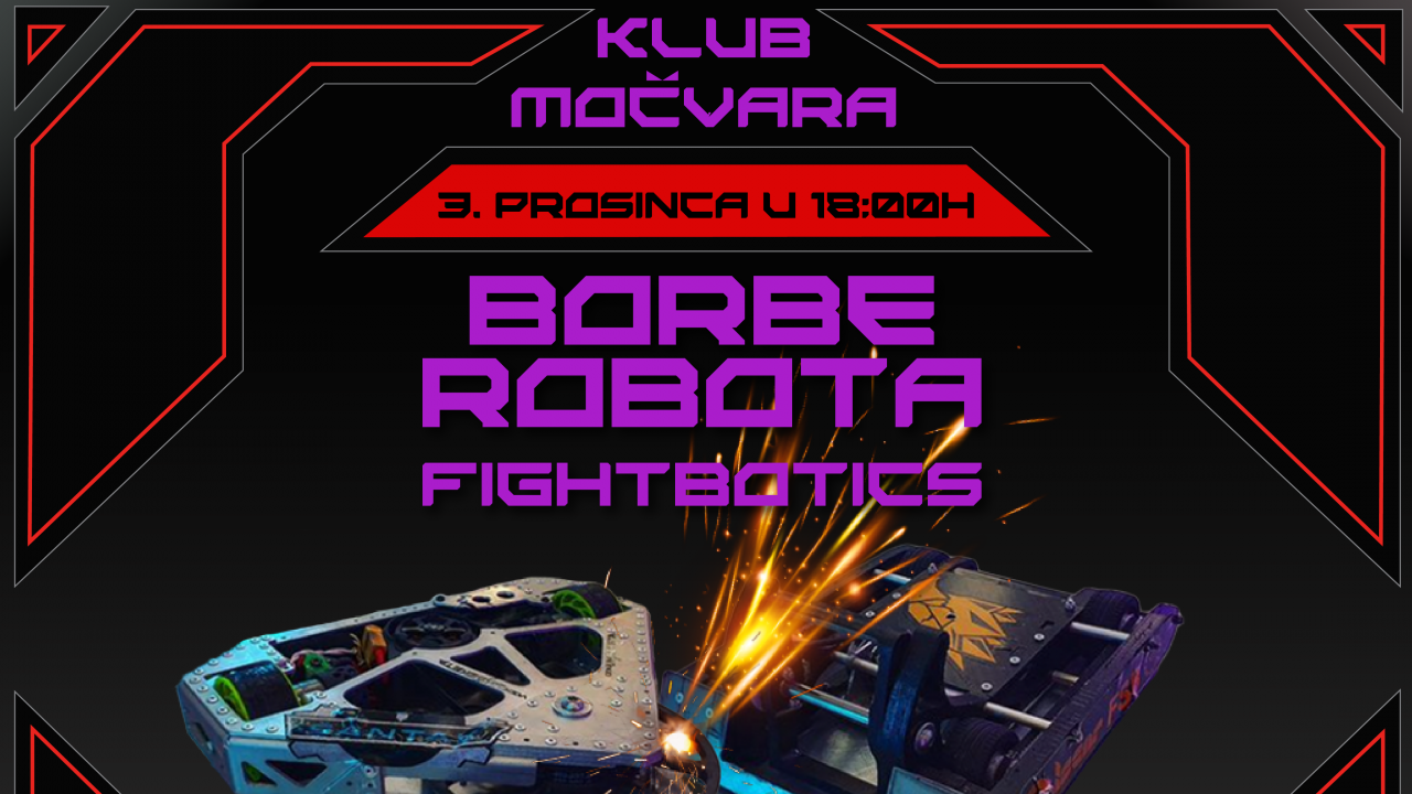 Fightbotics 3.12. u Močvari Fightbotics - hrvatske borbe robota, događaj u organizaciji studenata FER-a i FSB-a, omogućuje robotičarskim entuzijastima da upogone svoje borbene mašine i međusobno se bore u našoj custom-made areni za borbu. U klubu Močvara 3.12.2023. u 18 sati moći ćete svjedočiti kaotičnom svijetu borbenih robota uz frcanje iskri, plamen i eksplozije te komentiranje svevremenskog Maria Kovača i DJ Fixa. Ulaznice možete potražiti na eventim.hr | |